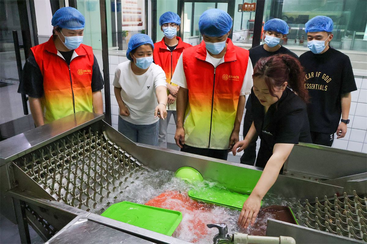 在餐厅经理及负责人的带领下,同学们依次参观了餐厅的环境、明厨亮灶等设施以及日常工作流程展示区。随后,同学们根据个人兴趣随机分成若干小组,深入后厨操作、台账记录等岗位的实践学习与沉浸式体验。