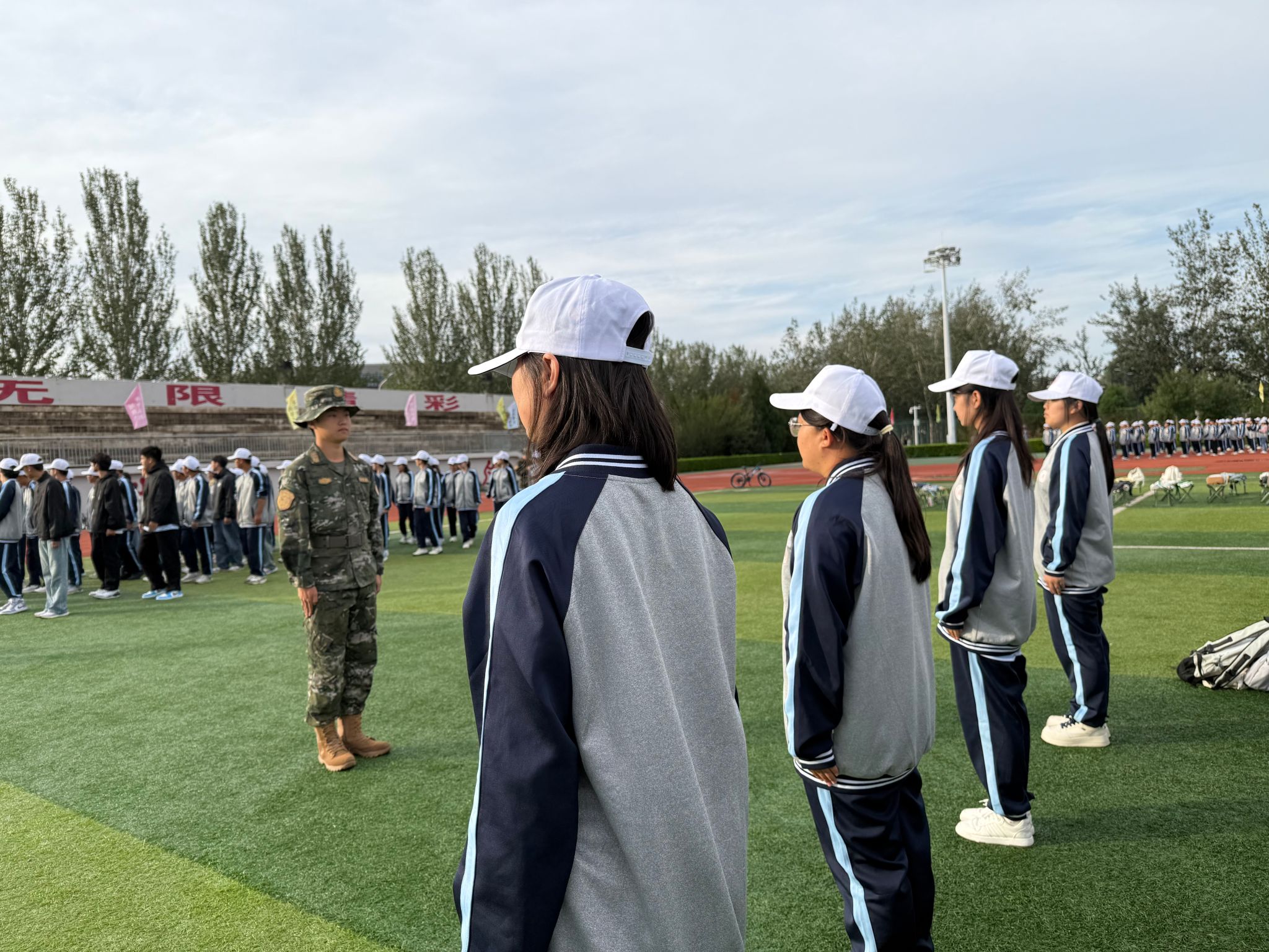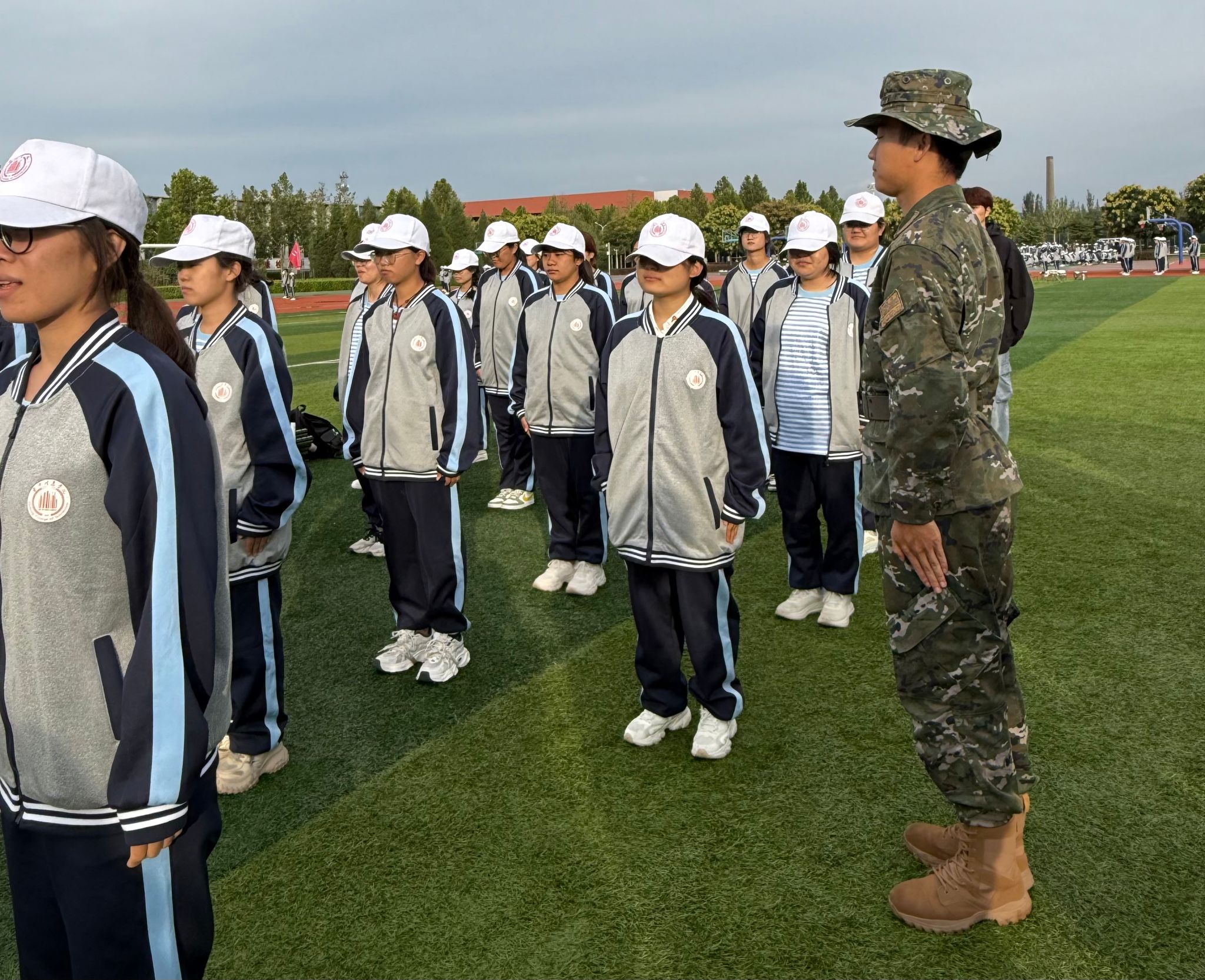 训练期间,大家经受着体能和意志的双重考验。我从站军姿到走正步,看着同学们从生疏松散变得整齐有力。曾有一位同学正步总是走不好,我陪他反复练习分解动作,直到他自信地跟上队伍——那一刻,所有的付出都变得值得。