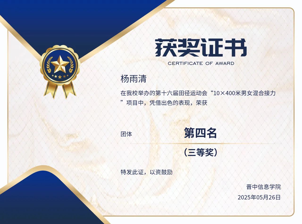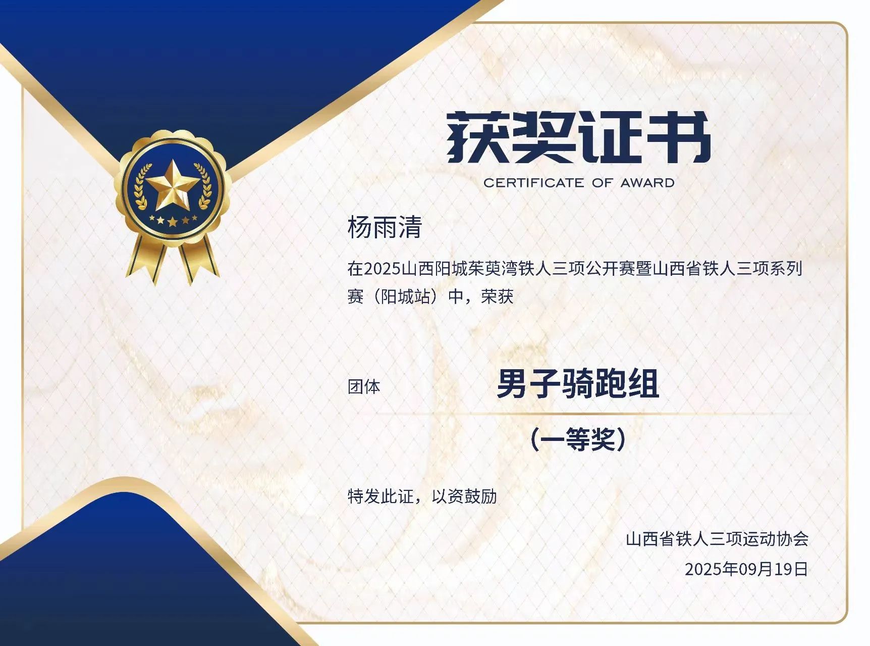 今年他还参加了铁三“至强杯”和阳城茱萸湾铁人三项赛。在这期间,他不断突破自己,不断刷新最好成绩,身体各方面取得很大进步。功夫不负有心人,在2025年山西阳城茱萸湾铁人三项公开赛中,“小胖”和他的团队一举荣获男子骑跑组一等奖!